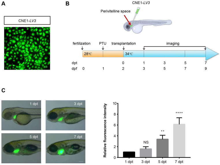 Xenograft of human nasopharyngeal carcinoma CNE1 cells in zebrafish. (A) Expression of GFP after transfection was detected in the stabilized cell line of CNE1 cells. Scale bar: 50 μm. (B) Top: diagram of the establishment of zebrafish xenograft model. Bottom: experimental protocol. (C) Left: xenograft model of zebrafish at 1, 3, 5, and 7 dpt. Fluorescent and bright fields are merged, respectively. Scale bar: 1 mm. Right: the relative fluorescence intensity of tumor cells transplanted into zebrafish was quantified. The quantity of tumor cells at 1 dpt was used as the baseline, with which the quantity of tumor cells at other time points was compared. Data were quantitatively analyzed using one-way ANOVA (n = 4 fishes analyzed). Data are shown as mean ± SD. GFP: green fluorescent protein; PTU: phenylthiourea; dpt: days post-transplantation; dpf: days post-fertilization; NS: not significant. **P < 0.01; ****P < 0.0001.