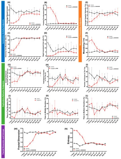 Fig. 4 Figure 4. Comparison of grouped zebrafish behaviors in 3D locomotion test between caudal fin-amputated (red) and untreated (black) groups (shoal size = six fishes) during 30 days of observation. Twelve endpoints were measured and categorized into three groups. (A) Average speed, (B) freezing time movement ratio, (C) swimming time movement ratio, and (D) rapid movement time ratio belong to the locomotor activity endpoints group, while the movement orientation endpoints group consists of (E) average angular velocity and (F) meandering. Finally, the exploratory behavior endpoints group is composed of (G) average distance to the center of the tank, (H) total distance traveled in the top, (I) number of entries to the top, (J) time in top duration, (K) time in middle duration, and (L) time in bottom duration. In addition, (M) fractal dimension and (N) entropy analyses between groups are also added. Data from Figure 4A–L are expressed in the median with 95% CI, while Figure 4M,N are expressed in the mean with SEM. All data were analyzed by mixed models two-way ANOVA continued with Sidak’s multiple comparisons test (n = 18, except for caudal-fin-amputated group on day 25–30 (n = 17); ** p < 0.01, *** p < 0.001, **** p < 0.0001).