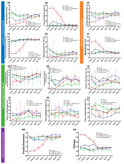 Fig. 6 Figure 6. Comparison of grouped zebrafish behaviors in 3D locomotion test between caudal-fin-amputated group (red), caudal-fin-amputated + 5 ppm lidocaine group (blue), 5 ppm lidocaine-treated group (green), and untreated (black) group (shoal size = six fishes) over 10 days observation. Twelve endpoints were measured and categorized into three groups. (A) Average speed, (B) freezing time movement ratio, (C) swimming time movement ratio, and (D) rapid movement time ratio belong to the locomotor activity endpoints group, while the movement orientation endpoints group consists of (E) average angular velocity and (F) meandering. Finally, the exploratory behavior endpoints group is composed of (G) average distance to the center of the tank, (H) total distance traveled in the top, (I) number of entries to the top, (J) time in top duration, (K) time in middle duration, and (L) time in bottom duration. In addition, (M) fractal dimension and (N) entropy analyses between groups are also added. Data from Figure 6A–L are expressed in the median with 95% CI, while Figure 6M,N are expressed in the mean with SEM. All data were analyzed by mixed models two-way ANOVA continued with Sidak’s multiple comparisons test (n = 18, except for the caudal-fin-amputated + lidocaine group on day 2–3 (n =17) and 5–10 (n = 16) and lidocaine-treated group on day 5 (n =17) and 8–10 (n = 16); ** p < 0.01, *** p < 0.001, **** p < 0.0001).