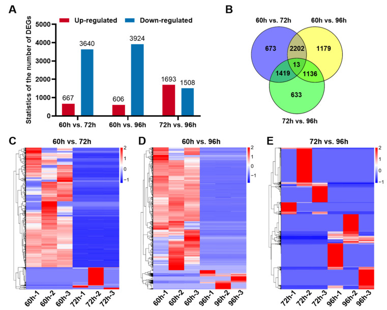The differentially expressed genes analysis in early liver developmental stages. (A) Statistics of differentially expressed genes (DEGs) in hepatocytes between two time points. (B) The Venn diagram analysis of DEGs in hepatocytes among three time points. Heatmaps of DEGs between two time points, including 60 and 72 hpf (C), 60 and 96 hpf (D), as well as 72 and 96 hpf (E).