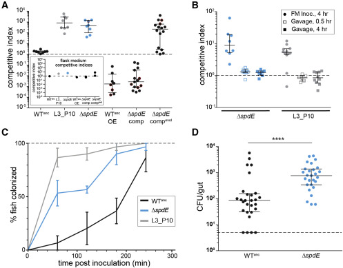 Figure 2. Loss of spdE enables rapid immigration into hosts and fish-to-fish transmission (A) Competitive indices (CI) of ancestral Aer01 (WTanc), an evolved isolate (L3_P10), ΔspdE, the WT overexpressing spdE (WTanc_OE), ΔspdE complemented with WT copy of spdE (ΔspdE_comp), and ΔspdE complemented with an evolved mutant allele (ΔspdE_compevol). All strains were competed against a WT reference strain (see Figure S1A). Points outlined in red represent a lower or upper bound for the actual CI (see STAR Methods). Dotted line indicates CI of 1 (i.e., no competitive advantage). n ≥ 8 fish/condition, one experimental replicate. Inset graph presents CI data for Aer01 mutants in the flask medium (a single point for each flask); y axis and symbols match the main graph. (B) Competitive indices of ΔspdE and L3_P10 evolved isolate are dependent on mode of inoculation (flask medium [FM inoc.] versus gavage). Dotted line indicates CI of 1 (i.e., no competitive advantage). n ≥ 6 fish/condition, one experimental replicate. (C) Immigration rates of ancestral Aer01, ΔspdE, and the L3_P10 mono-associated into larval fish (see STAR Methods and Figure S3A) (n = 3 experimental replicates per time point). Means (± SEM) are plotted. (D) Fish-to-fish transmission of ancestral Aer01 (WTanc) and ΔspdE. Mono-associated “donor” fish were added to a flasks of GF “recipient” fish for 15 h, then abundances of Aer01 in all fish were determined. n ≥ 27 fish/condition, two experimental replicates. p value < 0.0001, two-tailed Mann-Whitney test. CFU/gut, colony-forming units per gut. Median and interquartile ranges are plotted in (A, B, and D). See also Figure S2.