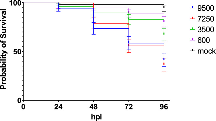 Dose dependent killing of zebrafish embryos by H44/76_B expressing mCherry (numbers in cfu, 20 embryos in each group). Triplicate with 20 embryos in each group.