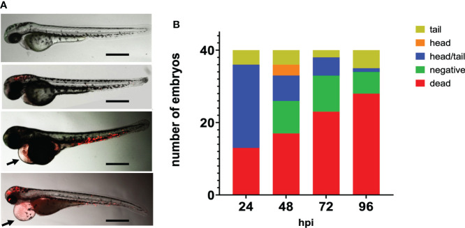 Fluorescence microscopy of zebrafish embryos at 28 hpf infected with mCherry expressing H44/76_B meningococci (5000 cfu).