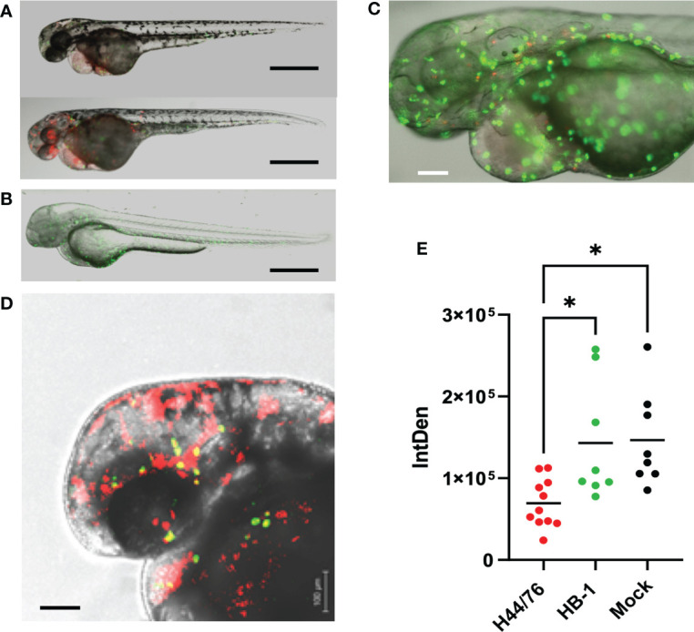Fluorescence microscopy of H44/76 meningococci expressing mCherry (red fluorescence) and neutrophils expressing GFP (green fluorescence) in zebrafish embryos.