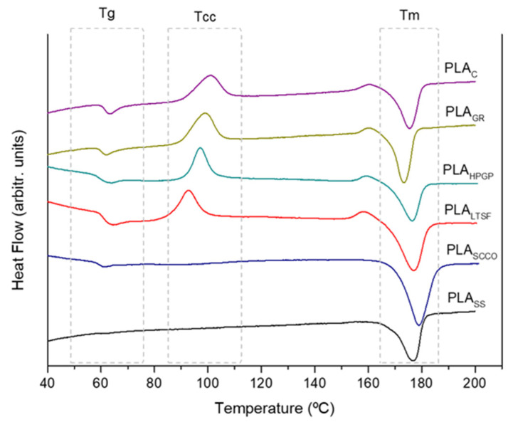 DSC thermograms for PLA discs subjected to the different sterilisation treatments: PLAGR, PLASCCO, PLALTSF, PLASS and PLAHPGP together with the untreated PLA disc as control, PLAC.
