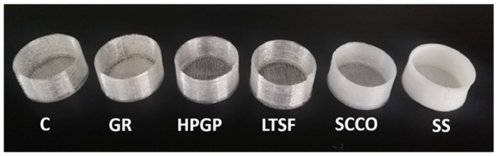 Image of 3D-printed PLA well samples before (untreated control C) and after five sterilisation processes: (GR) gamma radiation, (HPGP) hydrogen peroxide gas plasma, (LTSF) low temperature steam formaldehyde, (SCCO) supercritical CO2 and (SS) saturated steam.
