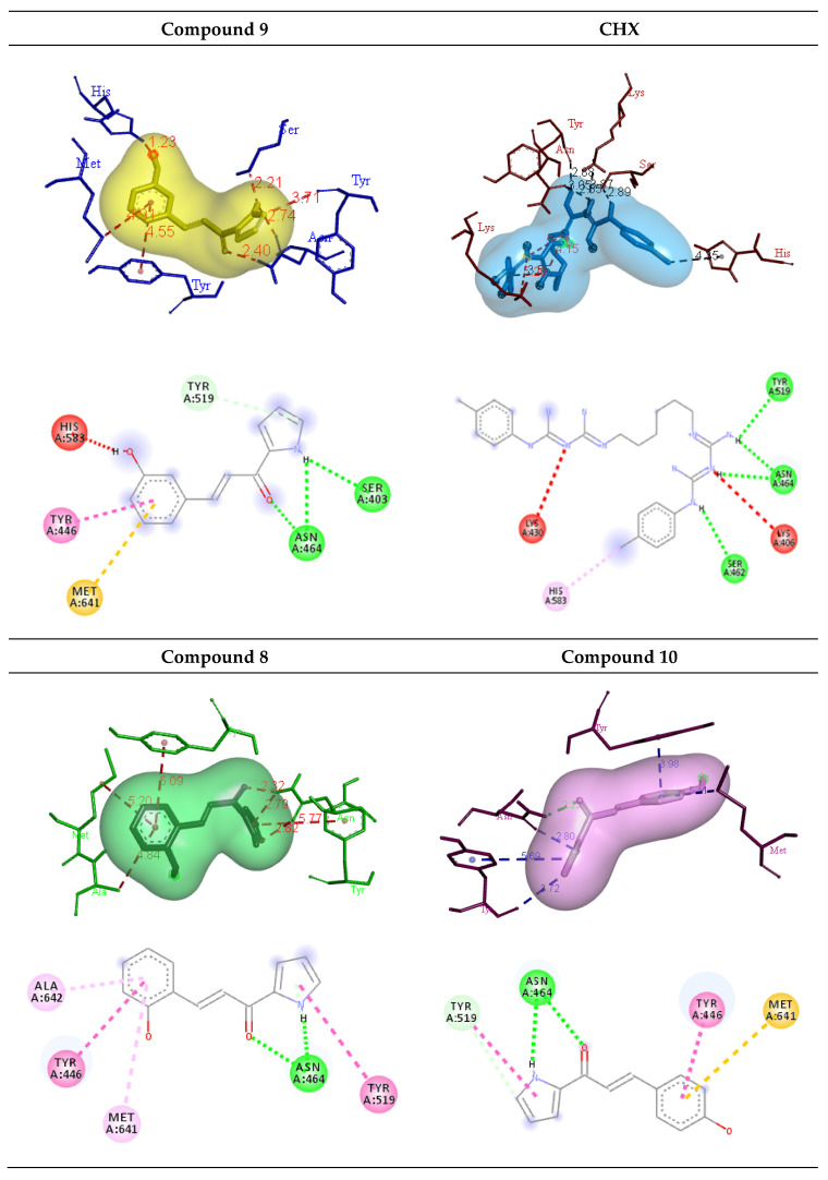 3D and 2D diagrams of the binding interaction of hydroxylated compounds 8, 9, and 10 (green line: H bond; light green line; carbon H bond/π-donor H bond; red line: donor-donor; yellow line: π-sulphur; pink line: π-π stacked/π-π T-shaped; light pink line: π-alkyl) and CHX (green line: H bond; red line: positive-positive; light purple line: π -alkyl) with the amino acid residues on the active site of the PBP2a receptor.