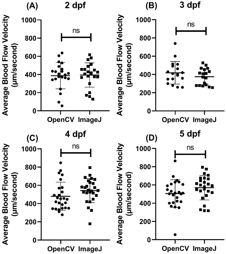 Validation of the performance of OpenBloodFlow GUI package for blood flow velocity measurement through comparison with ImageJ method. Zebrafish embryos aged (