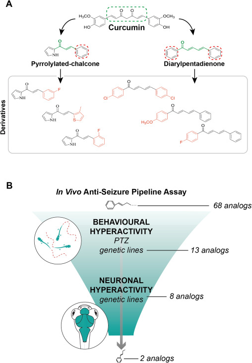 Fig. 1. In vivo anti-seizure pipeline to test curcumin analogs (A). Illustration of the structural modifications in two notable analogue families used in this study in comparison to the base compound curcumin. (B) Our pipeline follows a funnel approach that whittled down an initial 68 analogues to two promising candidates using zebrafish larval behavioural and neuronal hyperactivity assays.