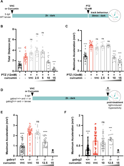 Fig. 2. Anti-seizure property of curcumin in vivo (A) Timeline of the experimental procedure corresponding to our PTZ behavioural hyperactivity assay. (B & C) Quantification of the total distance travelled (m) and maximum acceleration (m/s2) of 5 dpf zebrafish larvae treated or not with PTZ 12 mM and pre-incubated or not with curcumin at different concentrations (0 – 15 µM) The * ** * marker denotes significance at P < 0.0001 respectively as compared to the 12 mM PTZ only group using one-way Analysis of Variance (ANOVA) followed by Dunnett's post hoc test. (D) Timeline of the experimental procedure corresponding to our behavioural hyperactivity assay using gabra1-/- and gabrg2-/- genetic seizure models. (E, F) Quantification of the maximum acceleration (m/s2) of gabra1 + /+ and -/- (E) or gabrg2 + /+ and -/- (F) larvae. Larvae were incubated with different concentration of curcumin (10 – 15 µM). The * ** * marker denotes significance at P < 0.0001 respectively as compared to the homozygous (-/-) group using one-way Analysis of Variance (ANOVA) followed by Dunnett's post hoc test. VHC (vehicle) treatments correspond to 0.1% DMSO.