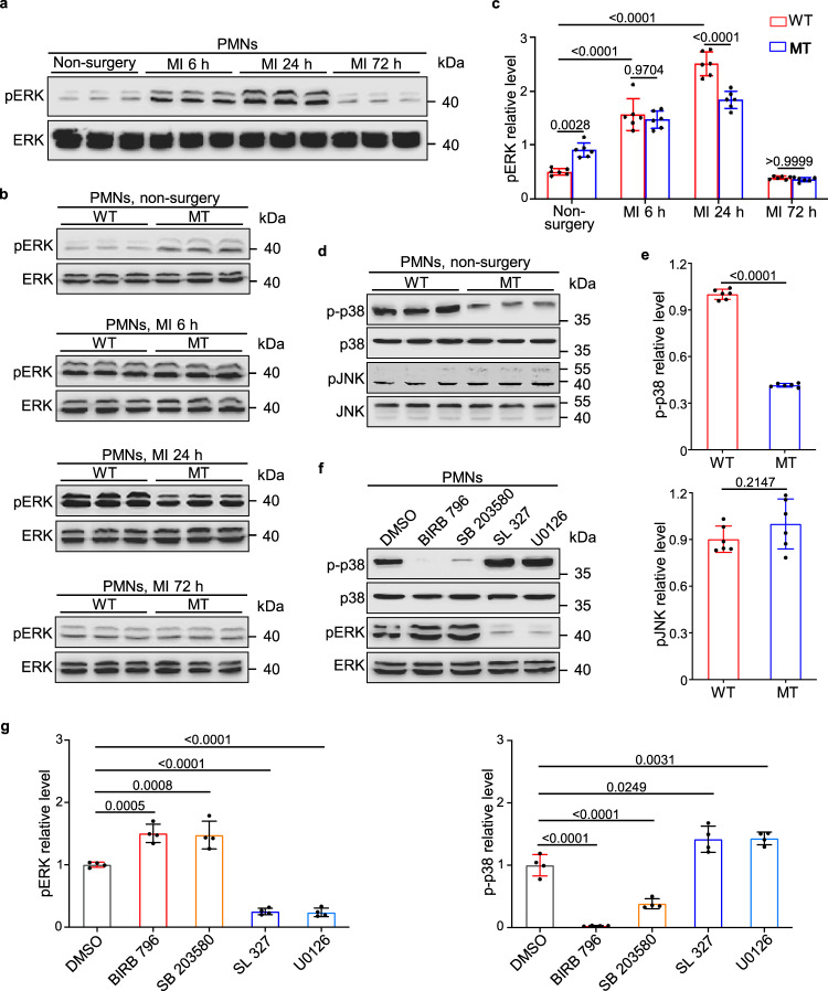 Fig. 7 a Western blot of pERK in WT PMNs in unoperated controls and 6–72 h after MI (n = 6/group). Both blots were performed in parallel with the same samples. b, c Western blot and quantitative analysis of pERK levels in WT and Dusp6-deficient PMNs in unoperated controls and 6–72 h after MI (n = 6/group). d, e Western blot and quantitative analysis of p-p38 and pJNK in PMNs from unoperated WT and Dusp6-deficient rats (n = 6/group). f, g Western blot and quantitative analysis of pERK and p-p38 levels in unoperated WT PMNs treated with either p38 inhibitors (BIRB796 and SB203580) or MEK1/2 inhibitors (SL327 and U0126). DMSO was used as a negative control (n = 4 independent experiments). All blots within each individual panel were performed in parallel with the same samples. All quantitative data shown in this figure are presented as mean values ± SD. One-way ANOVA with Tukey’s multiple comparison test (for c and g) and Two-sided unpaired T-test (for e) were used to calculate the presented p-values. Source data of a–g are provided in a Source Data File. WT wild-type, MT Dusp6 mutant.