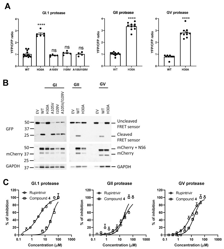 Compound 4 and rupintrivir block the norovirus protease. (A) The FRET signal was lost upon co-transfection with the wild-type (WT) or a mutated protease (A105V, I109V, A105V/I109V). The signal remained upon co-transfection with the inactive (H30A) protease. (B) Western blot of HEK293T cells co-transfected with the GI, GII or GV WT or mutant proteases along with the FRET construct. Cleavage was observed in the WT and mutant proteases in all genogroups. EV: empty vector. (C) Dose–response curves of compound 4 and rupintrivir on the WT proteases. Mean values ±SEM are presented, Mann–Whitney test **** p < 0.0001, ns: not significant.