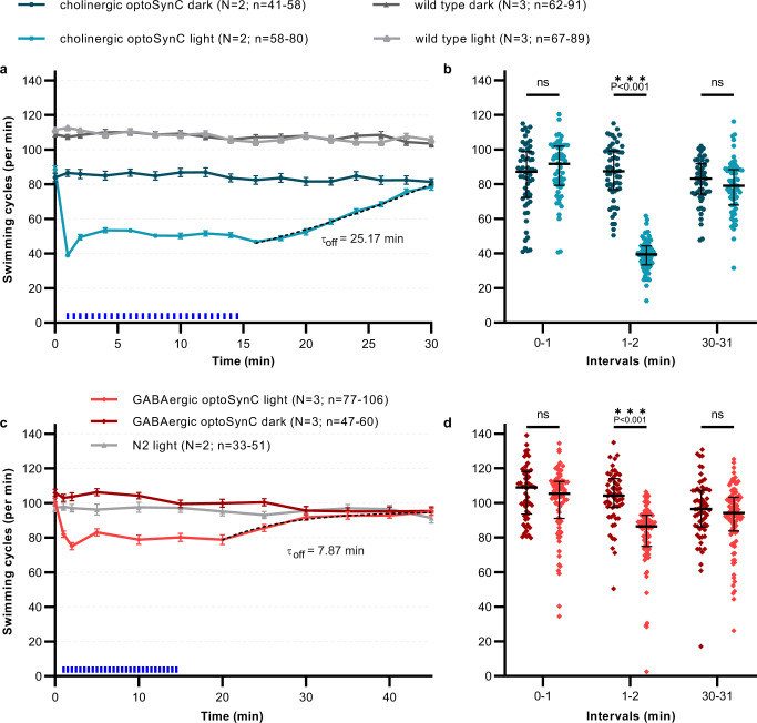 a Swimming behavior in animals expressing optoSynC in cholinergic neurons. Blue light activation (470 nm, 0.1 mW/mm², 5 s/25 s ISI) indicated by blue rectangles. Dotted line: ‘plateau followed by one phase association’-fit. Error bars are s.e.m. Number of individual animals (n) across independent experiments (N, i.e. animals picked from N independent populations) is indicated as range. b Swimming cycles of individual animals, median and 25–75 % IQR of N = 2–3 experiments analyzed in time intervals before (0–1 min), during (1–2 min), and after (30–31 min) blue light illumination; number of individual animals (n) across all experiments from left to right: 58, 58, 57, 72, 53, 64. Two-way ANOVA with Bonferroni correction between light and dark measurements of wild type and cholinergic optoSynC expressing strains; ***p < 0.001. c, d as for a, b, but optoSynC was expressed in GABAergic neurons. Number of individual animals (n) from left to right: 77, 55, 86, 56, 98, 60.