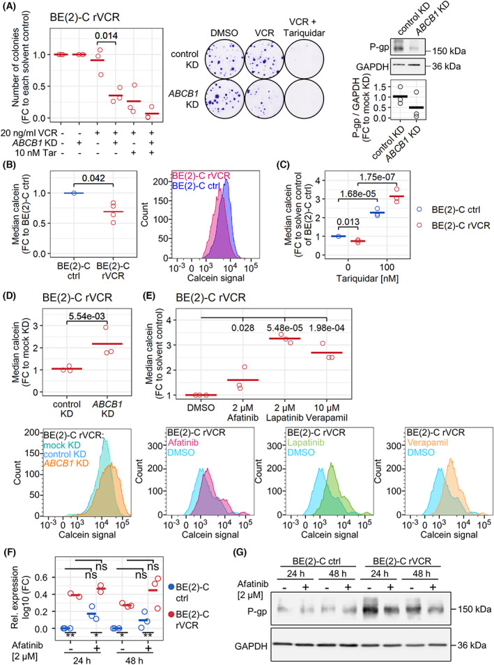 P‐gp mediates resistance in BE(2)‐C rVCR. (A) a colony assay was performed after ABCB1 knockdown or negative control transfection. Knockdown was induced for 24 h with subsequent treatment with 20 ng·mL−1 VCR and/or 10 nm tariquidar for 72 h. After medium change, colonies were left to grow for 9 days. Representative example images of three biological replicates are shown. Quantification is depicted as the colony number normalized to the solvent control of each knockdown. Three biological replicates and their means are shown. Statistics of log‐transformed values were calculated with Student's t test. The knockdown efficiency was validated by western blotting. Quantifications were normalized to GAPDH and negative control transfection. (B) Untreated control BE(2)‐C and BE(2)‐C rVCR were stained with 10 nm calcein for 15 min and analyzed by flow cytometry. The right panel depicts a representative calcein signal distribution of four biological replicates. The median calcein signal, normalized to control BE(2)‐C, is depicted on the left. Statistics of log‐transformed BE(2)‐C rVCR values were calculated with Student's t test against 0. (C) Control BE(2)‐C and BE(2)‐C rVCR were treated with 100 nm tariquidar for 24 h and stained with 10 nm calcein for 15 min. Intracellular calcein was analyzed by flow cytometry. Median calcein normalized to the solvent control of BE(2)‐C ctrl is shown. Depicted are biological replicates (n = 3) and their mean. Statistics were computed by ANOVA of the log‐transformed values followed by Tukey's post‐test. (D) ABCB1 knockdown and negative control transfection were performed in BE(2)‐C rVCR for a total of 48 h, followed by staining with 100 nm calcein for 30 min. Intracellular calcein was assessed by flow cytometry. The lower panel shows a representative calcein signal distribution of three biological replicates. The upper panel depicts the median calcein signal normalized to negative control transfection. Three biological replicates and their means are shown. Statistics were calculated on log‐transformed values with Student's t‐test. (E) BE(2)‐C rVCR cells were treated with the indicated concentrations of afatinib, lapatinib, or verapamil for 24 h and stained with 10 nm calcein for 15 min. Intracellular calcein was analyzed by flow cytometry. Median calcein was normalized to solvent control. Depicted are biological replicates (n = 3) and their mean. Representative calcein signal distributions are depicted in the lower panels. Statistics were computed by ANOVA of the log‐transformed values followed by Tukey's post‐test. (F, G) BE(2)‐C ctrl and rVCR were treated for 24 and 48 h with 2 μm afatinib. ABCB1 mRNA (F) and P‐gp protein (G) levels were evaluated by RT–PCR and western blotting, respectively. GAPDH served as a loading control. Statistics were calculated with ANOVA followed by Tukey's post‐test. Shown are the statistics for the comparisons between the cell lines (bottom) as well as the comparisons to solvent control for each cell line (top).