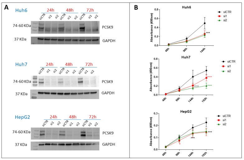 Figure 2 Effect of PCSK9 silencing by siRNA on liver cancer cell proliferation. (A) Validation of the depletion of PCSK9 by siRNA silencing. Cell extracts were prepared 24, 48 and 72 h after transfection with a control siRNA (siCTR) or targeting PCSK9 (si1 and si2) of Huh6, Huh7 or HepG2 cells. A total of 40 µg of cell proteins were loaded per lane on an SDS-PAGE. After electrophoresis and transfer, the membrane was analyzed by Western blot using anti-PCSK9 and GAPDH antibodies for comparison of loading. The two bands observed for PCSK9 correspond to the pro-PCSK9 (74 kDa) and cleaved PCSK9 (60 kDa). (B) Evaluation of liver cancer cell proliferation by MTS after transfection with si1 and si2 in comparison with siCTR. Two-way ANOVA test, *** p < 0.001; **** p < 0.0001 (n = 3, with 3 technical replicates within each biological replicate).