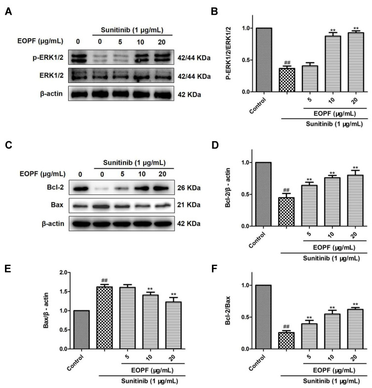 EOPF promoted angiogenesis by increasing p-ERK/ERK and Bcl-2/Bax expression ratios. (A) The protein levels of p-ERK (Thr202/Tyr204), ERK, and β-actin were examined by Western blot. (B) EOPF increased the ratio of p-ERK/ERK. (C) The protein levels of Bcl-2, Bax, and β-actin were measured via Western blot. (D) EOPF increased Bcl-2 expression levels. (E) EOPF decreased Bax expression levels. (F) EOPF increased the ratio of Bcl-2/Bax. Results are presented as the mean ± SD for three individual experiments. ##P < 0.01 vs untreated control, **P < 0.01 vs sunitinib.