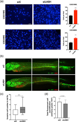 Fig. 3 Silencing of LKB1 enhances GBM cell invasion. (a) U3031MG and U3034MG cells transfected with unspecific (siC) or LKB1-targeting (siLKB1 pool) siRNA were analyzed in invasion assays. Representative invading cell images (left, scale bar = 20 µm) and quantification of invading cells (right, n = 3 in duplicate; 20 fields quantified per independent experiment). (b) In vivo invasive capacity of U3031MG after silencing LKB1 (siLKB1 pool), assessed in zebrafish embryos. Representative images of circulating, invading GBM cells (red-marked cells) and vasculature (green due to endothelial-specific EGFP expression) in transgenic zebrafish are shown. Extravasation and collagenous tail fin invasion are observed (right-hand photomicrograph). Invading cells per fish, n = 40 were quantified, and presented as mean ± SEM. Statistical comparison (t-test); significant differences at ***p < 0.001. GBM, glioblastoma; LKB1, liver kinase B1; SEM, standard error of the mean; siRNA, small interfering RNA