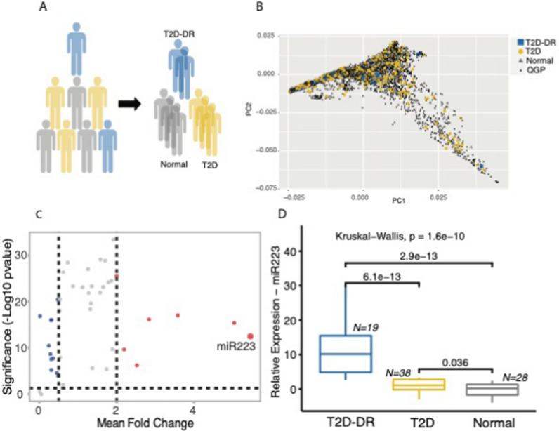 miR-223-3p is upregulated in individuals with type 2 diabetes and diabetic retinopathy. A A sub-cohort of individuals selected from the Qatar Genome Programme (QGP) participants were stratified into T2D patients and Normal controls based on self-reporting of a physician diagnosis for diabetes or HbA1c levels greater than 6.5%. T2D individuals with diabetic retinopathy (T2D-DR) were identified by examining the retinal images. B Principal component analysis based on biallelic germline variants presents the distribution of case- and control-study samples across the nationwide QGP population with no selection bias in the representative sample. C mi-R223 was identified as the top-upregulated miRNA in our target panel with elevated expression in T2D. D Amongst T2D individuals, miR-223-3p expression was significantly higher in plasma from individuals with DR (T2D-DR) compared to Controls and T2D individuals without DR. Boxplots show the distribution of relative expression for miR-223-3p across all study samples