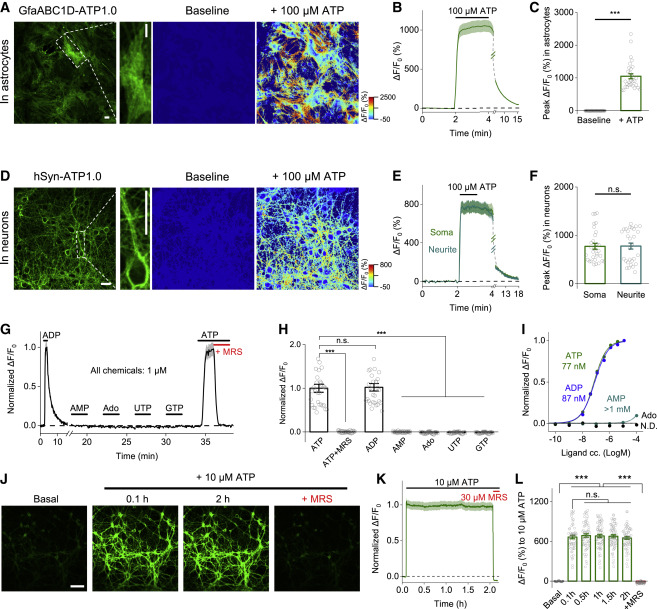 Figure 2. Characterization of the GRABATP1.0 sensor in primary cultured astrocytes and neurons (A–C) ATP1.0 was expressed in cultured cortical astrocytes and measured using confocal imaging. (A) Raw GFP fluorescence image (left) and pseudocolor images of the baseline and peak response (ΔF/F0) to 100 μM ATP. (B) Time course of ΔF/F0; 100 μM ATP was applied where indicated. (C) Summary of the peak ΔF/F0 measured before and after application of 100 μM ATP; n = 30 regions of interest (ROIs) each from three coverslips. (D–F) Same as (A)–(C), except ATP1.0 was expressed in cultured rat cortical neurons; n = 30 ROIs each from three coverslips. (G–I) Normalized ΔF/F0 measured in cultured neurons expressing ATP1.0, showing an example trace (G), summary data (H), and dose-response curves with corresponding EC50 values (I). UTP, uridine triphosphate; GTP, guanosine triphosphate; N.D., not determined. n = 30–91 ROIs from three coverslips (H and I). (J–L) Fluorescence image (J), trace (K), and summary (L) of ATP1.0 expressed in cultured hippocampal neurons during a 2 h application of 10 μM ATP; n = 60 neurons from three coverslips. Scale bars represent 30 μm (A and D) and 100 μm (J). Summary data are presented as mean ± SEM. The data in (C) and (F) were analyzed using Student’s t test; the data in (H) and (L) were analyzed using one-way ANOVA followed by Bonferroni’s multiple-comparison test; ∗∗∗p < 0.001; n.s., not significant. See also Figures S3 and S6.