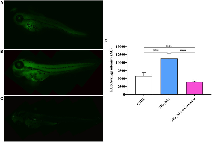 Total ROS production in (A) untreated larvae, (B) TiO2-NPs-treated larvae, and (C) TiO2-NPs-treated larvae in the presence of carnosine 20 mM (1 h pre-treatment). Carnosine was kept during the exposure to TiO2-NPs. The average fluorescence intensity (AU) of at least 5 values for fixed larva is reported in (D). SD is represented by vertical bars. ***Significantly different, p < 0.001. n.s., not significant.