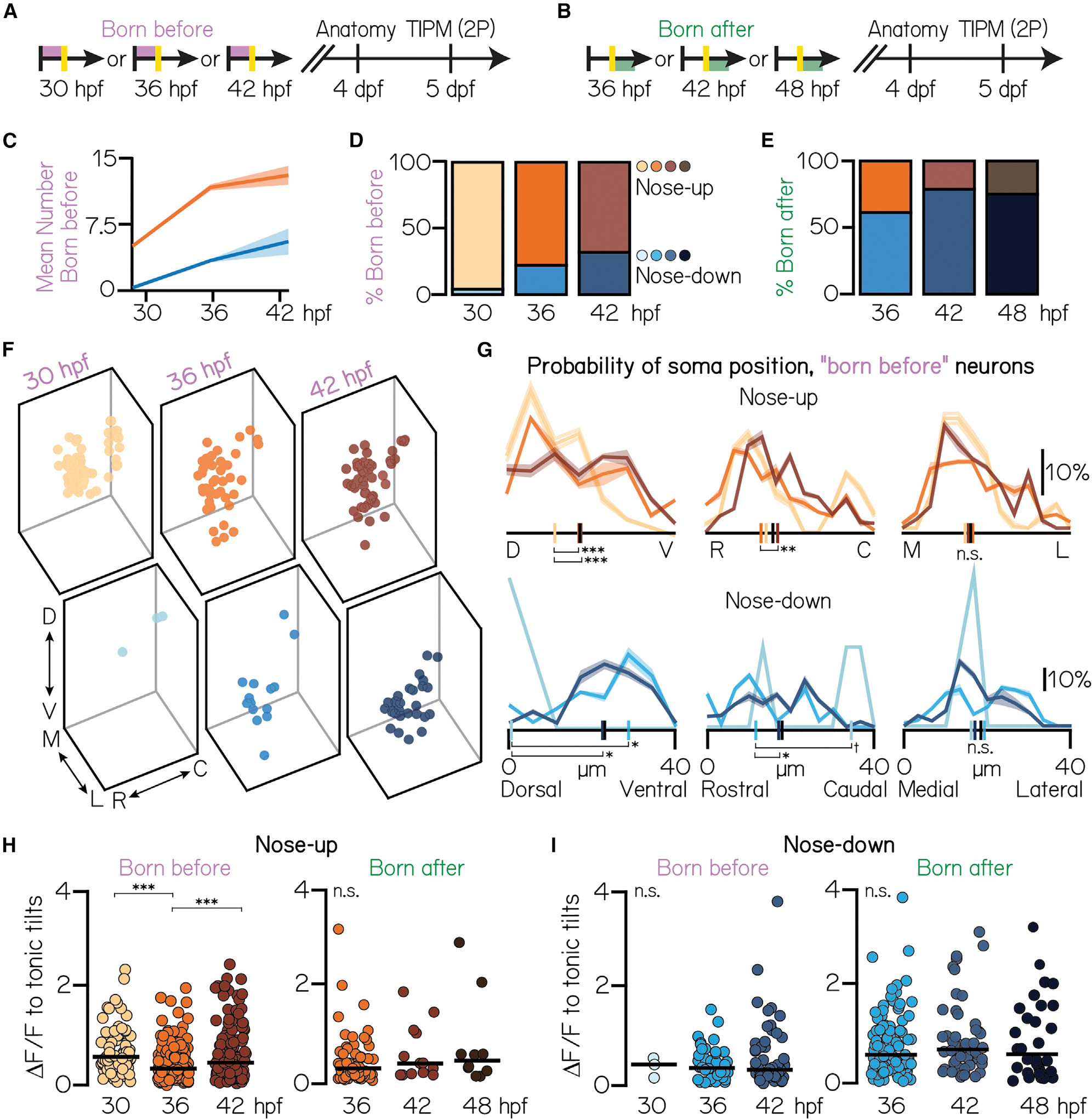 (D) Percent of nose-up and nose-down neurons born before each age. Orange shades, nose-up; blue shades, nose-down. 30 hpf data are from the same N = 7 fish as in Figures 1G, ,1H,1H, ,3B,3B, and and3C.3C. 36 hpf: n = 208 sampled “born before” neurons from N = 7 fish; 42 hpf: n = 198 sampled born before neurons from N = 5 fish.