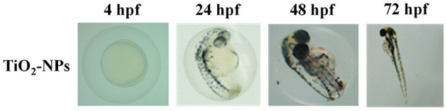 Effects of TiO2-NPs on the phenotypes of both embryos and larvae at different (4, 24, 48, and 72) hpf.