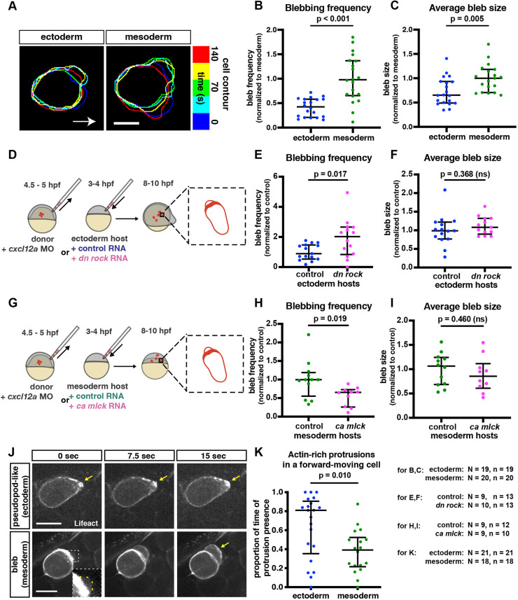 Alterations in protrusive behavior in PGCs located within different environments. (A) Overlay of cell contours over time of representative PGCs migrating in ectodermal and mesodermal tissues. Contours were aligned to the back of the cell to correct for forward movement. Arrow indicates the direction of migration. Scale bar: 10 µm. (B,C) Blebbing frequency (B) and average bleb size (C) of PGCs moving within converted embryos. For bleb frequency comparison (B), a Mann–Whitney test was performed; for average bleb size (C), a two-tailed t-test was performed. (D) The PGC transplantation experiment scheme. Labeled wild-type PGCs were transplanted into ectoderm-converted embryos that were injected at the one-cell stage with either control RNA or a dominant-negative form of ROCK. 4 to 6 h later, blebs formed by the transplanted PGCs were analyzed. (G) A similar transplantation was performed into mesoderm-converted embryos that expressed either control RNA or RNA encoding a constitutively active form of MLCK. (E,F,H,I) Bleb formation frequency (E,H) and average bleb size (F,I) produced by PGCs transplanted into the different environments. Two-tailed t-tests were performed. (J) Snapshots of migrating PGCs. Arrows indicate actin enrichment at the edge of protrusion. Inset shows a zoomed-in, contrast-adjusted view of the early-stage bleb, with a yellow dashed line outlining the bleb contour. Scale bars: 15 µm. (K) The proportion of time actin-rich protrusions that are present at the front of a forward-moving cell. Mann–Whitney test was used. The graphs show the median; whiskers indicate the interquartile range (IQR). N and n at the bottom right represent numbers of embryos and cells, respectively.