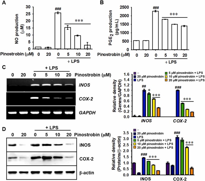 Fig. 2 Pinostrobin suppresses LPS-stimulated NO and PGE2 production along with iNOS and COX-2 expression. RAW 264.7 macrophages were pretreated with the indicated concentrations of pinostrobin (0–20 μM) for 2 h, followed by treatment with 300 ng/mL LPS for 24 h. Release of (A) NO and (B) PGE2 to the culture media was measured using Griess reagent assay and ELISA, respectively. (C) Total RNA was extracted 6 h after LPS treatment, and RT-PCR was performed. The expression of iNOS and COX-2 was normalized relative to GAPDH expression. (D) After 12 h-incubation with LPS, cell lysates were prepared for western blotting. β-Actin was used to normalize iNOS and COX-2 expression. The relative density was calculated using ImageJ software. ##, p < 0.01 and ###, p < 0.001 vs. untreated cells; *, p < 0.05 and ***, p < 0.001 vs. LPS-treated cells.