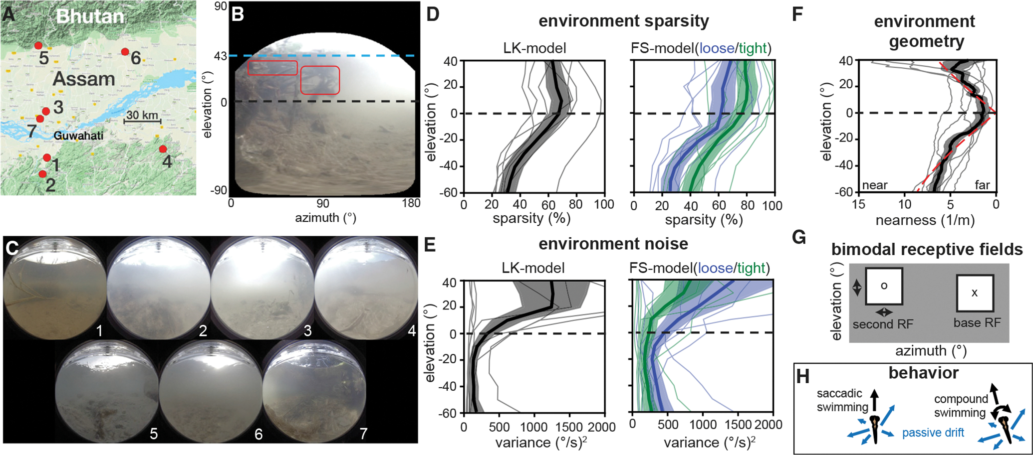 (F) The geometry estimated from optic flow vector magnitudes roughly matches a floor+ceiling model (dashed red) below the water line (~40°). Individual sites, SEM, and mean are plotted in the same manner as in (D) and (E).