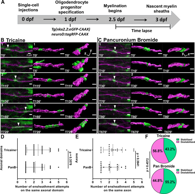 (A) Axonal ensheathment dynamics experimental paradigm. (B–C) Representative lateral images of repetitive ensheathments forming in the spinal cord of living Tg(nkx2.2:eGFP-CAAX) (myelin in green) larvae time-lapsed for 18 hr with a 5 min imaging interval starting at 2.5 days post fertilization (dpf). Axons were labeled with neuroD:tagRFP-CAAX (magenta). Scale bars = 2 µm. (B) Example from larva that was anesthetized in tricaine. (C) Example of larva that was anesthetized in pancuronium bromide. (D) Plot showing the number of times each axonal domain was ensheathed for the tricaine and pancuronium bromide groups (n=37 axonal domains for tricaine, n=29 axonal domains for pancuronium bromide). (E) The same data as in (D), but normalized by axon. When more than one domain was observed on an axon, the total number of ensheathments attempts for each domain was averaged (n=21 axons for tricaine collected from 15 larvae, n=20 axons for pancuronium bromide collected from 16 larvae). For (D) and (E), the dotted lines represent the average number of ensheathment attempts for each group. The error bars represent standard deviation. (F) Pie chart of the percent of axonal domains that were stabilized vs. destabilized. The top pie chart is for the tricaine group and the bottom pie chart is for the pancuronium bromide group. Significance was determined using non-parametric Mann-Whitney tests for (D, E). Significance was determined using a Fisher’s exact test for (F) (see associated source data and supplementary video files).