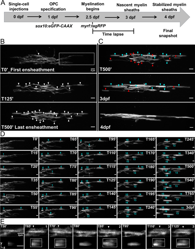 (A) Oligodendrocyte ensheathment dynamics imaging paradigm. (B–E) Lateral images of oligodendrocyte ensheathment dynamics in the spinal cord of living larvae labeled with sox10:eGFP-CAAX and time-lapsed for 15 hours with a 5-minute imaging interval from 2.5-3dpf. (B) Images show the progression of immature sheath accumulation from the first ensheathment attempt in the first panel (set at T0’) to the final ensheathment at T500’ in the bottom panel. Outlined region in first panel is analyzed further in Figure D and E. White arrows identify all immature ensheathments in each frame. (Scale bar = 5 μm). (C) Images showing sheath loss during the stabilization phase. T500’ image is presented again in the top panel and is relabeled to identify future stabilized (cyan) or destabilized (red) ensheathments. This oligodendrocyte has 22 immature sheaths at T500’, 11 of which disappeared, and it has 11 stabilized sheaths at 4dpf in the final panel (Figure 4—figure supplement 2). (Scale bar = 5 μm). (D) Images of the outlined region in the first panel of B visualizing frequent sheath initiation and loss. Each ensheathment is represented with the numbers 1-19 to signify the order that each one appears. The numbers disappear when an ensheathment is lost. Only 5 ensheathment attempts were stabilized out of a total of 19. (Scale bar = 2 μm) (E) Further enlarged images of the outlined region in Figure D (T50’). White arrows point out 3 ensheathment attempts before the final one was stabilized. The YZ images are cross sections of each ensheathment (volume projections in Imaris). A box is drawn around each cylindrical ensheathment in the YZ images. (Scale bar = 2 μm). (See associated source data and supplementary video files).