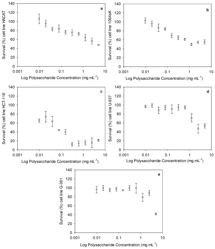 Cytotoxic activity of ulvan polysaccharides, expressed as survival (%) of each cell line depending on the ulvan polysaccharide concentration (mg mL−1). Each figure represents a cell line: (a) immortalized human keratinocytes (HACAT), (b) human fibroblasts (1064SK), (c) human colorectal carcinoma cell line (HCT-116), (d) human myeloid leukemia (U-937), and (e) human malignant melanoma (G-361).