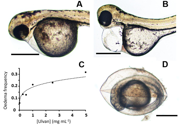Pericardial edema and chorion lysis increase with the ulvan polysaccharide concentration. Slight (A) and significant (B) pericardial edemas are seen in zebrafish embryos treated with a 0.25 mg mL−1 ulvan concentration. (C) Exponential regression of edema frequency versus ulvan polysaccharide concentrations (y = 0.0386x0.2325, R2 = 0.9351). (D) Chorion lysis observed at 2.5 mg mL−1 ulvan. Bars represent 500 µm.