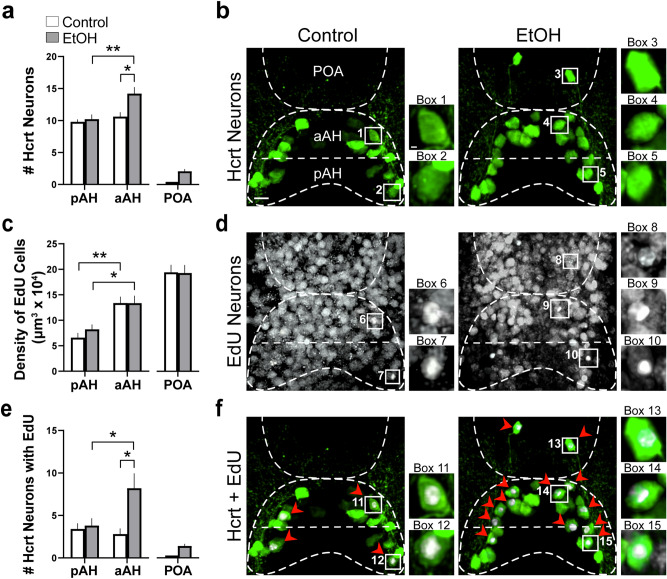 Effects of exposure to embryonic EtOH (0.5% v/v, 22–24 hpf) on the number of Hcrt neurons, the density of EdU cells, and the number of Hcrt neurons co-expressing EdU within the pAH, aAH and POA of 6 dpf transgenic Hcrt:EGFP zebrafish brains. (a) Bar graphs (n = 5/group) show that EtOH increases the number of Hcrt neurons in the aAH but not the pAH relative to control, causes the number in the aAH to be greater than in the pAH of EtOH-treated zebrafish, and induces a few ectopic Hcrt neurons (2.2 ± 0.374) further anterior in the POA that are not detected in control zebrafish. (Two-way ANOVA, EtOH main effect: (F (1, 16) = 7.339, p = 0.016), Brain area main effect: (F (1, 16) = 10.57, p = 0.005), EtOH x Brain area interaction: (F (1, 16) = 4.697, p = 0.046), followed by Holm-Sidak post-hoc described in the text). (b) Photomicrographs (40×, dorsal view) illustrate Hcrt neurons (green) after immunofluorescence staining that are located in the pAH and aAH of control and EtOH-treated zebrafish and are ectopically expressed in the POA of EtOH-treated zebrafish. Boxes 1–2 show enlargements of single Hcrt neurons in the aAH and pAH of control, respectively, and boxes 3–5 show enlargements of Hcrt neurons in the POA, aAH, and pAH of EtOH, respectively. (c) Bar graphs (n = 5/group) show that the density of EdU cells in the aAH is greater than the density in the pAH of both control and EtOH zebrafish, and EtOH has no effect on the density of EdU-expressing cells in the pAH, aAH or POA. (Two-way ANOVA, EtOH main effect: EtOH main effect (F (1, 24) = 0.199, p = 0.660), Brain area main effect: (F (2, 24) = 43.03, p < 0.0001), EtOH x Brain area interaction: (F (2, 24) = 0.291, p = 0.751), Holm-Sidak post-hoc test described in text). (d) Photomicrographs (25×, dorsal view) show EdU labeling (white) in the pAH, aAH and POA of control and EtOH zebrafish. Boxes 6–7 show enlargements of EdU cells located in the aAH and pAH, respectively, of control zebrafish, and boxes 8–10 show enlargements of EdU cells located in the POA, aAH, and pAH of EtOH-treated zebrafish, respectively. (e) Bar graphs (n = 5/group) show that EtOH increases the co-expression of Hcrt with EdU in the aAH but not the pAH, and in the EtOH-treated zebrafish there are more Hcrt neurons co-expressing EdU in the aAH than the pAH. Ectopic POA Hcrt neurons are also found to co-express EdU in EtOH-treated zebrafish (1.4 ± 0.245). (Two-way ANOVA, EtOH main effect: (F (1, 16) = 7.188, p = 0.164), Brain area main effect: (F (1, 16) = 3.085, p = 0.0981), EtOH x Brain area interaction: (F (1, 16) = 5.342, p = 0.420), followed by Holm-Sidak post-hoc described in the text). (f) Photomicrographs (25×, dorsal view) illustrate an overlay of Hcrt (green) and EdU labeling (white) and their co-expression. Boxes 11–12 show enlargements of single Hcrt neurons co-expressing EdU in the pAH and aAH of control, respectively, and boxes 13–15 show enlargements of single Hcrt neurons co-expressing EdU in the POA, aAH, and pAH, respectively. Scale bars: low magnification 10 µm; high magnification 2 µm. All results are shown as means ± standard errors. Abbreviations: EtOH: ethanol, aAH: anterior part of the anterior hypothalamus, pAH: posterior part of the anterior hypothalamus, POA: preoptic area, Hcrt: hypocretin, EdU: 5–ethynyl–2′–deoxyuridine, hpf: hours post fertilization, dpf: days post fertilization.