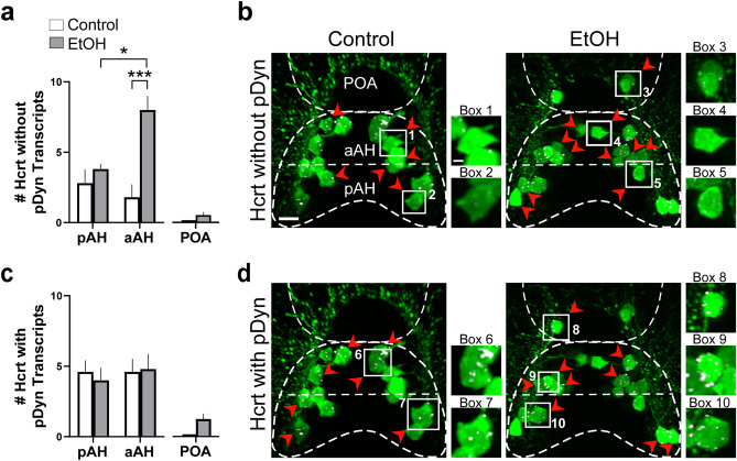 Effects of exposure to embryonic EtOH (0.5% v/v, 22–24 hpf) on the number of Hcrt neurons with and without co-expression of transcripts of the neuropeptide pDyn within the pAH, aAH and POA of 6 dpf transgenic Hcrt:EGFP zebrafish brains. (a) Bar graphs (n = 5/group) show that EtOH increases the number of Hcrt neurons with no pDyn expression in the aAH but not the pAH, causing the aAH to have a greater number of Hcrt neurons with no pDyn expression than the pAH and inducing an ectopic Hcrt neuron (0.6 ± 0.245) in the POA of EtOH-treated zebrafish having no pDyn expression. (Two-way ANOVA, EtOH main effect: (F (1, 16) = 17.75, p = 0.0007), Brain area main effect: (F (1, 16) = 3.507, p = 0.0794), EtOH x Brain area interaction: (F (1, 16) = 9.260, p = 0.0078), followed by Holm-Sidak post-hoc described in the text). (b) Photomicrographs (40×, dorsal view) illustrate Hcrt neurons (green) after immunofluorescence and RNAscope staining with no pDyn (white) expression, as indicated by red arrows. Boxes 1–2 show enlargements of single Hcrt neurons with no pDyn expression located in the aAH and pAH of control, respectively, and boxes 3–5 show enlargements of Hcrt neurons with no pDyn expression located in the POA, aAH, and pAH of EtOH-treated zebrafish, respectively. (c) Bar graphs (n = 5/group) show that EtOH compared to control has no effect on the number of Hcrt neurons with pDyn expression in the pAH or aAH and induces some (1.2 ± 0.374) ectopic Hcrt neurons in the POA of EtOH treated zebrafish having pDyn expression. (Two-way ANOVA, EtOH main effect: treatment (F (1, 16) = 0.046, p = 0.833), Brain area main effect: (F (1, 16) = 0.1850, p = 0.6729), EtOH x Brain area interaction: (F (1, 16) = 0.1850, p = 0.6729), followed by Holm-Sidak post-hoc described in the text). (d) Photomicrographs (40×, dorsal view) illustrate Hcrt neurons (green) after immunofluorescence and RNAscope staining with pDyn (white) expression, as indicated by red arrows. Boxes 1–2 show enlargements of single Hcrt neurons with pDyn expression located in the aAH and pAH of control, respectively, and boxes 3–5 show enlargements of Hcrt neurons with pDyn expression located in the POA, aAH, and pAH of EtOH-treated zebrafish, respectively. Scale bars: low magnification 10 µm; high magnification 2 µm. All results are shown as means ± standard errors. Abbreviations: EtOH: ethanol, pDyn: prodynorpin, aAH: anterior part of the anterior hypothalamus, pAH: posterior part of the anterior hypothalamus, POA: preoptic area, Hcrt: hypocretin, hpf: hours post fertilization, dpf: days post fertilization.