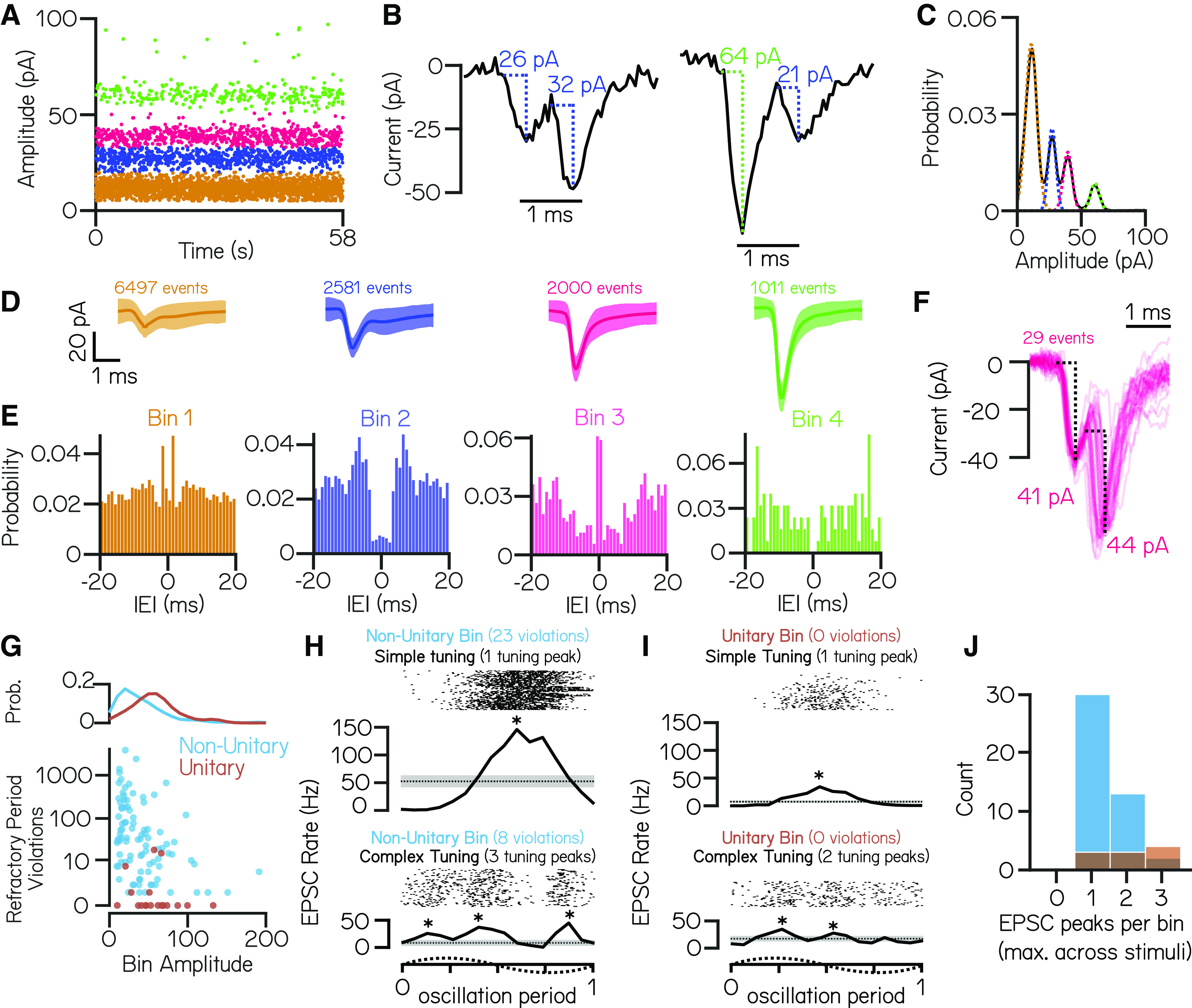EPSC events within the same amplitude bin predominantly reflect multiple neuronal inputs. A, An example cell with four stable and discrete amplitude bins (colored by bin). B, Example EPSC traces demonstrate events that co-occur within 1 ms. Event pairs are either within-bin (left) or across-bin (right). C, To estimate an upper limit on the expected refractory period violations because of bin overlap, EPSC amplitude distributions were modeled as a sum of individual Gaussians (dashed colored lines). D, Average waveforms from each EPSC bin (±SD; n = 6497, 2581, 2000, and 1011 events/bin). E, Autocorrelograms show structure of interevent intervals within an EPSC bin; note peaks near zero in bins 1 and 3, a nonzero valley for bin 2, and a true valley for the high-amplitude bin 4. F, Waveforms from EPSC pairs within bin 3 with latencies <1 ms (n = 29 event pairs). The large jitter between peaks is inconsistent with the expected profile of an electrochemical synapse. G, Observed within-bin refractory period violations as a function of bin amplitude for bins assigned as having nonunitary (blue) or unitary (brown) origin. The probability distribution of bin amplitudes is shown above. H, I, EPSC event timing from two example nonunitary (H) or unitary (I) bins aligned to one oscillation of lateral translation. EPSCs within a single bin can exhibit simple tuning with a single peak in EPSC rate (top) or can have complex tuning with multiple peaks in EPSC rate during oscillation (bottom). Asterisks indicate EPSC tuning peaks. J, Histogram of the number of EPSC rate peaks per amplitude bin during translation (maximum per bin across lateral and fore–aft stimuli) for nonunitary and unitary EPSC bins.