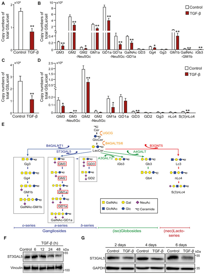 - C, DAverage copy numbers of (C) total GSL‐glycans and (D) individual GSL‐glycans per cell in A549‐VIM‐RFP cells treated with TGF‐β.