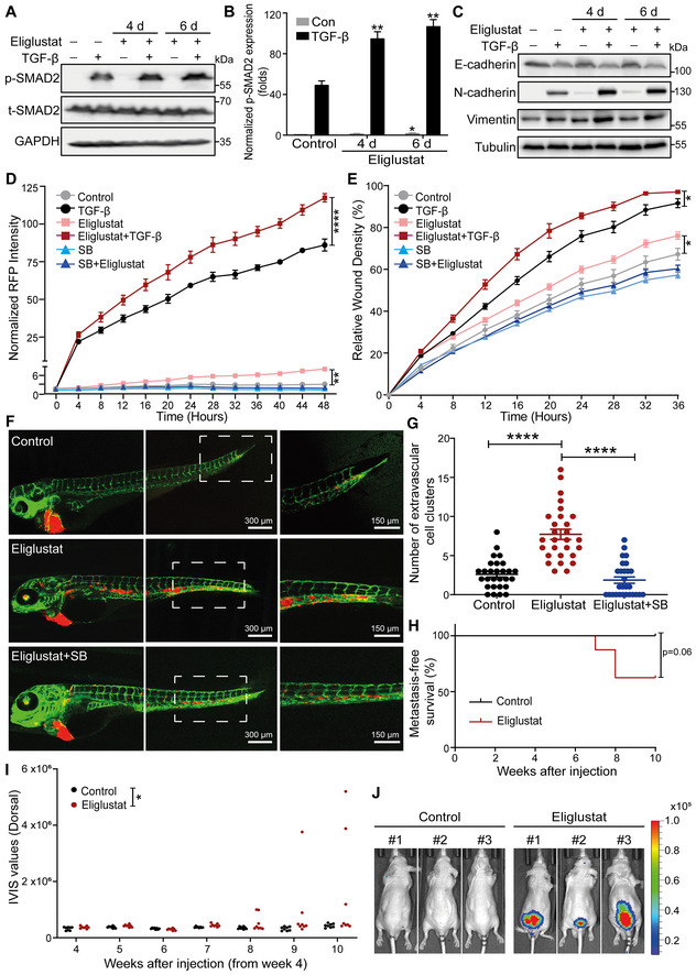 - Immunoblot analysis of p‐SMAD and t‐SMAD2 in A549‐VIM‐RFP cells pretreated with eliglustat for 4 or 6 days and then treated with vehicle control or TGF‐β for 1 h. GAPDH: loading control.