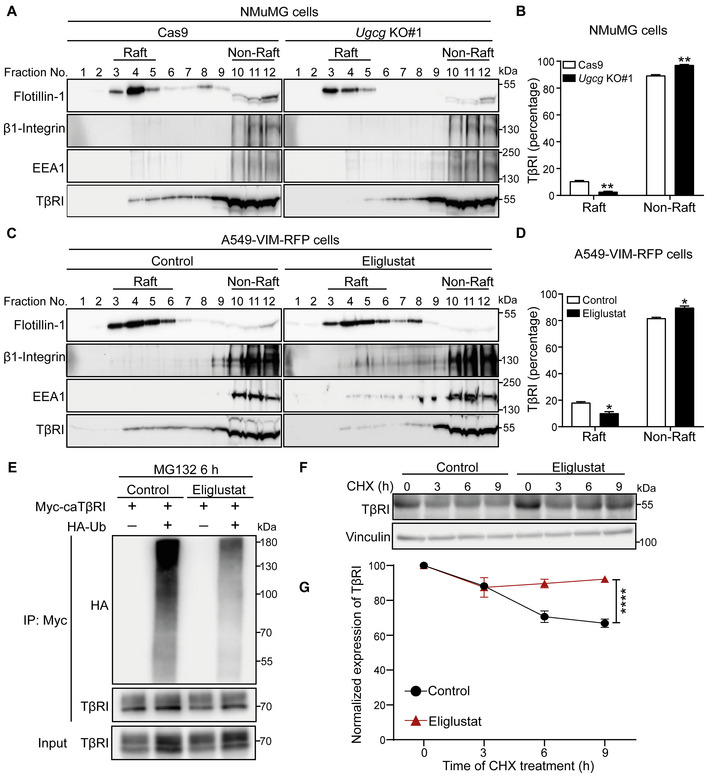 - Isolation of lipid rafts from other cellular components in A549‐VIM‐RFP cells treated with the UGCG inhibitor eliglustat (2 μM) for 6 days using sucrose density gradient ultracentrifugation and measurement of flotillin‐1, β1‐integrin, EEA1, and TβRI levels in the sucrose gradient fractions using immunoblot analysis. Fractions 3–6 contained lipid rafts, whereas fractions 10–12 corresponded to the non‐lipid raft fractions.
