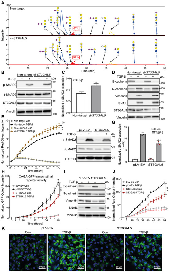 - Immunoblot analysis of p‐SMAD2 and t‐SMAD2 in A549‐VIM‐RFP cells transduced with empty vector (pLV‐EV) or the ST3GAL5 expression construct and stimulated with vehicle control or TGF‐β for 1 h. GAPDH: loading control.