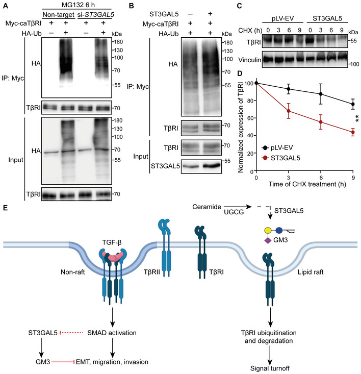 - Ubiquitination of TβRI was detected by IP of Myc‐tagged caTβRI from HA‐Ub‐transfected HEK293T cells with or without ST3GAL5 overexpression. All groups were treated with MG132 (5 μM) for 6 h.