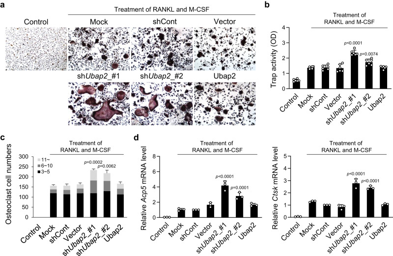 a, b Results of tartrate-resistant acid-phosphatase (TRAP) staining and TRAP activity assay in Ubap2-knockdown and -overexpressing monocytes. Monocytes from mouse bone marrow were incubated for 4 days after induction of osteoclast differentiation (n = 3 independent experiments; duplicate samples). c The distribution of multinuclear cells. Cells were categorized according to the number of nuclei; 3 ~ 5, 6 ~ 10, and more than 11. Multinuclear cells were counted and plotted. d mRNA expression levels of osteoclast differentiation-related genes in Ubap2-knockdown and -overexpressing cells. Quantitative reverse-transcription PCR was performed with the specific primers for Acp5 and Ctsk. Relative quantification of mRNA expression was presented as fold change relative to shCont (Day 4) and normalized to mouse Gusb expression (n = 3 independent experiments; duplicate samples). Control, no induction; Mock, no treatment; shCont, pLKO.1-puro empty vector; and Vector, pDON-5 Neo vector. Statistical differences of multiple groups were determined using one-way ANOVA, followed by Tukey’s honestly significant difference post hoc test. Exact p-values representing comparison to short hairpin RNA control (shCont) are shown. All data are presented as mean ± SD. Source data are provided as a Source Data file.