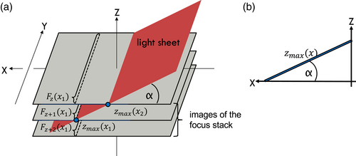 Determination of the beam tilt α in the xz-plane. (a) Three selected image planes from the z-focus stack. The light sheet intersects the image stack at different positions xi. These positions are designated as . (b) Determination of α by fitting a straight line to the measured .