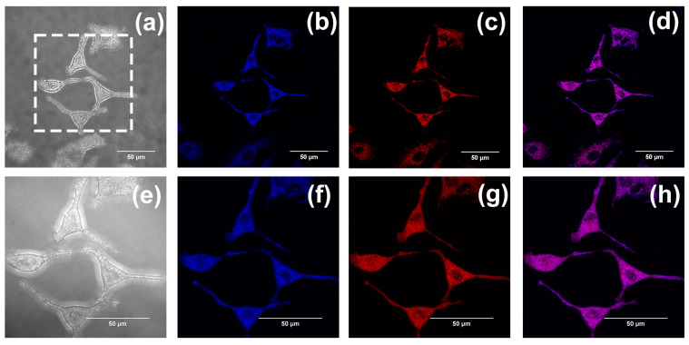 (a,e) The bright-field images of A549 cells incubated with compound 2. Co-localized images of A549 cells incubated with compound 2 (20 µM) (b,f) and Mito Tracker Red (200 nM) (c,g) for 30 min. (d,h) The merged images co-cultured with compound 2. The excitation wavelength of compound 2 was 405 nm. The excitation wavelength of Mito Tracker Red was 578 nm. (a–d) were taken using the confocal laser scanning microscope under a 60-fold lens, and (e–h) were taken under a 100-fold oil immersion lens. (e–h) are enlarged images of the dashed-square in (a). Scale bars, 50 µm.