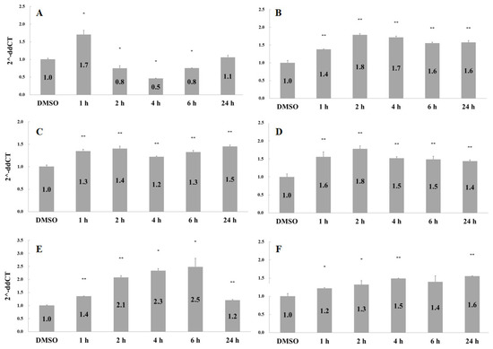 Fig. 4 Effects of catechu extracts on gene expression. HMEC-1 cells were treated with 0.1 ng/mL of catechu extracts for 1, 2, 4, 6, and 24 h. The gene expression levels for (A) IL-8, (B) FGFR2, (C) FGFR3, (D) NF-kB, (E) STAT3, and (F) vimentin were examined by quantitative PCR. Data are presented as means ± SD in three independent experiments. The p-value was calculated versus the control. Using one-tailed test analysis, * indicates p < 0.05 and ** indicates p < 0.005 between different times after catechu treatment. The DMSO group was the solvent control.