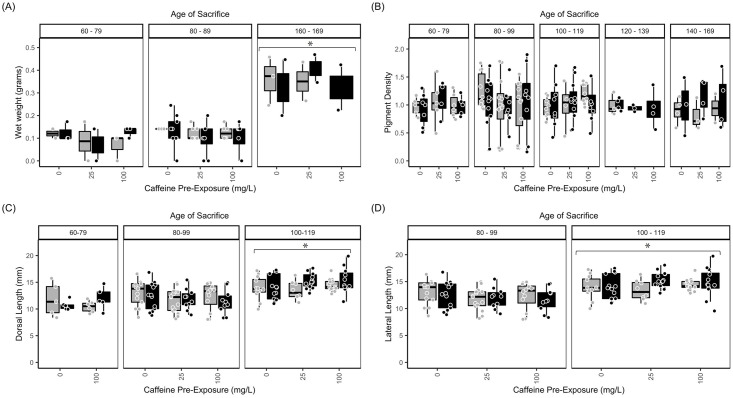 (A) Wet weight (g), (B) pigment density, (C) dorsal length (mm), and (D) lateral length (mm) measurements of zebrafish co-exposed to caffeine and ethanol. Measurements were taken immediately after the 7-d exposure period. Measurements were pooled to assess the effect of age of sacrifice across these experimental conditions. Exposure ages (dpf) are indicated at the top of the bar graphs. Black bars = 1.5% ethanol; gray bars = control (0% ethanol). Caffeine exposures (0, 25, or 100 mg/L) are given along the x-axis. Data from individual fish were assessed in age bins to facilitate comparisons: 60–79 dpf (juveniles); 80–99 dpf (young adult); 100–119; 120–139; 140–169 dpf (adult). Wet weight was collected from 60–79 dpf, 80–89 dpf, and 160–169 dpf fish only, to identify the largest differences. Neither caffeine nor ethanol exposure affected measurements. However, age-dependent differences were noted (asterisks). The boxplots show the minimum, first quartile, median, third quartile, and maximum values for each measure after outliers were removed. For weight (A), there were 3 independent replicates per treatment condition (each ethanol/caffeine dose) for a total of 18 subjects. For all other parameters (B, C, D) there were 7–9 independent replicates per treatment condition for a total of 51 subjects. ANOVA tables and multiple comparison results for this data can be found in