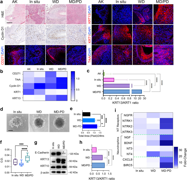 CD271 expression in cSCC biopsies and spheroids a Hematoxylin and Eosin (H&E) staining of AK, in situ, WD and MD/PD cSCC biopsies. CD271, Cyclin D1, TrkA, KRT1 and KRT13 expression evaluated by immunohistochemistry or immunofluorescence. Scale bar 100 µm. b Immunohistochemistry and immunofluorescence staining scored as follow: 0 (no cells; positivity to 20% of cells positivity), 0.1–0.75 (30–50% of cells positivity; 1–1.5 (60% to 100% of cells positivity). c Graphical representation of the KRT13/KRT1 intensity ratio. d Representative pictures of in situ, WD, and MD/PD spheroids. Scale bar = 100 μm. e Spheroid total area measured by ImageJ software and f spheroid viability evaluated by MTT assay. g Expression of E-cadherin, KRT13, and KRT10 evaluated in patient-derived spheroids by western blotting. β-actin was used as control. h Graphical representation of KRT13 and KRT10 relative protein expression ratio. i NTs and NTRs mRNA expression evaluated in patient-derived spheroids by qPCR. Heatmap created by Prism Graph pad software. β-actin was used as a housekeeping gene. For all experiments, the results are shown as mean ± SD of three independent experiments. Statistical analysis was performed using the two-way ANOVA. *0.01 < p < 0.05, ***0.0001 < p < 0.001, ****p < 0.0001