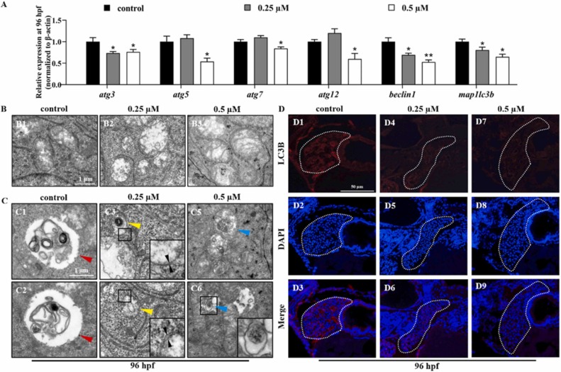 Fig. 4. Autophagy dysfunction and oxidative stress in zebrafish embryos. (A) Expressions of autophagy-related genes in the control and selenium-treated groups at 96 hpf. (B) TEM analysis of mitochondria of liver sections in control group (B1) and selenium‐stressed groups (B2, B3) at 96 hpf. (C) TEM analysis of hepatic cells in control group (C1, C2) and selenium‐stressed groups (C3-C6) at 96 hpf. (Red arrowheads indicate autolysosome, yellow arrowheads indicate autophagosome with double membrane, blue arrowheads indicate double membrane, blue arrowhead indicate autophagosome being engulfed progress) (D) Expression changes of LC3B in zebrafish liver in the control group (D1-D3) and selenium-stressed groups at 96 hpf (D4-D9). (**) p<0.01, (*) p<0.05.