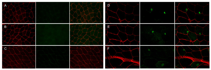 Immunofluorescence staining of the muscle biopsy from control subject and patient with p.Gly154Ser CRYAB mutation. Panels (A–C) (control), Panels (D–F) (patient). No focal areas of increased reactivity for αB-crystallin (Panel (A), green), desmin (Panel (B), green) and myotilin (Panel (C), green) in muscle fibers of control muscle. Focal accumulation of αB-crystallin (Panel (D), green), desmin (Panel (E), green) and myotilin (Panel (F), green) in two fibers of patient’s muscle biopsy. The percentage of fibers with aggregates is less than 15% of the total muscle fibers, and the percentage of the fiber area occupied by aggregates in the sections analyzed is 10.03 ± 2.15 for αB-crystallin, 5.78 ± 1.30 for desmin and 10.25 ± 0.81 for myotilin of the total muscle fiber area in this patient. Maackia amurensis lectin-II (MAL-II) staining (Panels (A–F), red) depicts the sarcolemma of muscle fibers. Images were obtained with obj ×20.
