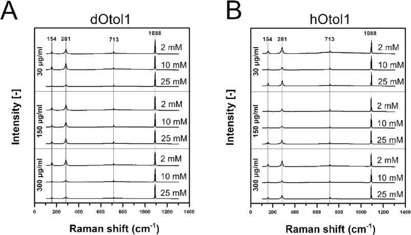 Fig. 2. Micro-Raman spectra of representative altered rhombohedral crystals grown in the presence of dOtol1 (A) and hOtol1 (B) in 30 μg/ml, 150 μg/ml, 300 μg/ml protein concentrations and 2 mM, 10 mM and 25 mM CaCl2 concentrations. The measured spectra confirm that the polymorphic form of the crystals consists of calcite, and the characteristic peaks are annotated with their corresponding wavenumbers.